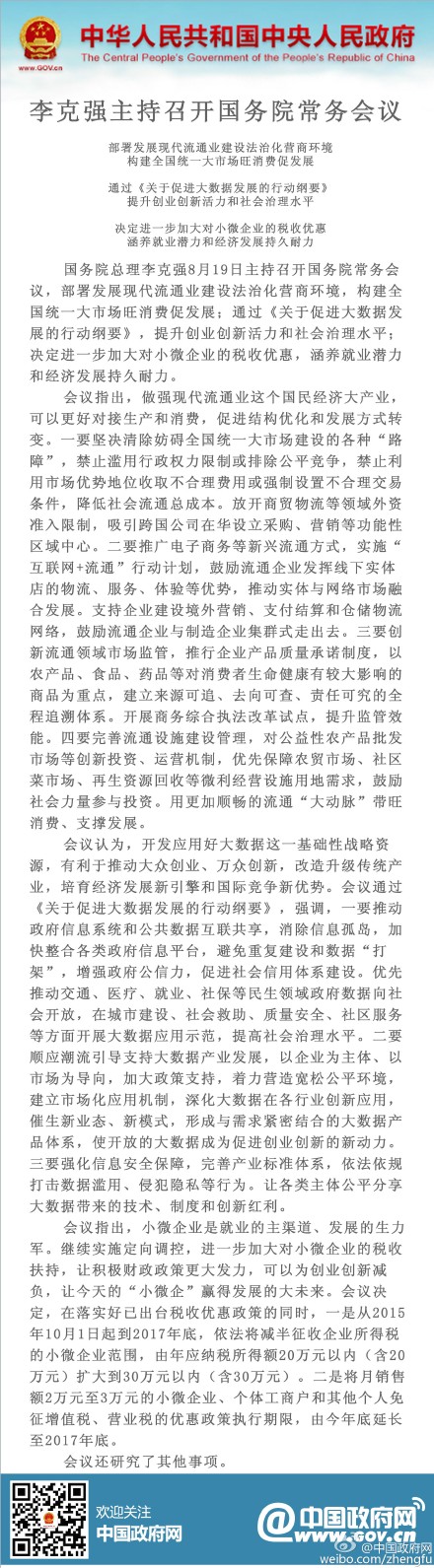 国务院总理李克强8月19日主持召开国务院常务会议,部署发展现代流通业建设法治化营商环境,构建全国统一大市场旺消费促发展;通过《关于促进大数据发展的行动纲要》,提升创业创新活力和社会治理水平;决定进一步加大对小微企业税收优惠,涵养就业潜力和经济发展持久耐力。