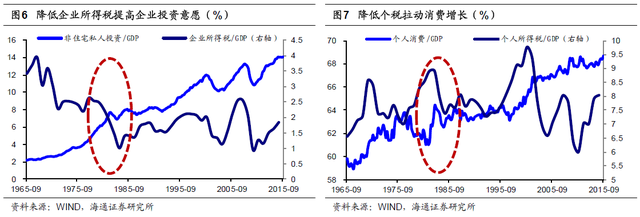 里根学派的核心是减税。以“里根经济学”为例,1981 年里根就任美国总统后,提出“经济复兴计划”,主要措施包括:降低税率,减少政府干预,缩减政府开支,紧缩货币供给。其中,个人所得税边际税率从70%降至28%,提高了可支配收入,增加了劳动供给意愿 ,也推动消费上行;而企业所得税率从46%降至33%,直接提高了企业盈利,也提高了企业投资意愿。里根经济学大获成功,令美国经济迎来“大稳健”时代,也为美国长期经济增长打下了坚实基础。