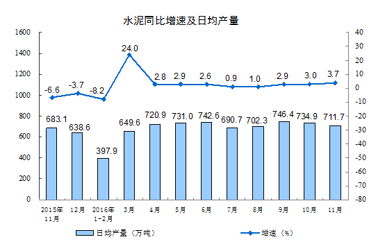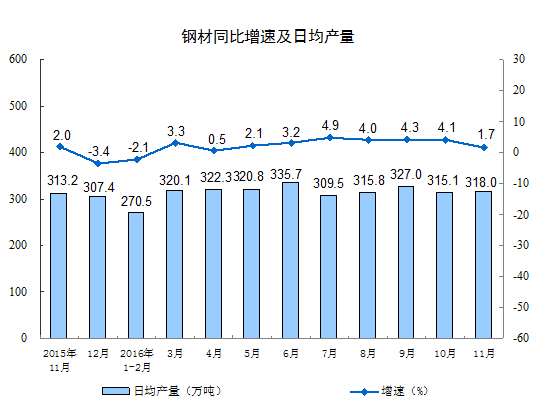 分产品看,11月份,统计的589种主要产品中有394种产品同比增长。其中,钢材9540万吨,同比增长1.7%;水泥21351万吨,增长3.7%;十种有色金属459万吨,增长2.3%;乙烯145万吨,下降0.5%;汽车300.0万辆,增长17.8%;轿车128.1万辆,增长6.4%;发电量5034亿千瓦时,增长7.0%;原油加工量4577万吨,增长3.4%。