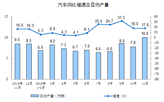 分行业看,11月份,41个大类行业中有30个行业增加值保持同比增长。其中,农副食品加工业增长7.2%,纺织业增长4.1%,化学原料和化学制品制造业增长5.4%,非金属矿物制品业增长6.4%,黑色金属冶炼和压延加工业下降7.3%,有色金属冶炼和压延加工业增长0.8%,通用设备制造业增长8.6%,专用设备制造业增长10.7%,汽车制造业增长19.5%,铁路、船舶、航空航天和其他运输设备制造业增长1.1%,电气机械和器材制造业增长7.5%,计算机、通信和其他电子设备制造业增长8.9%,电力、热力生产和供应业增长9.6%。