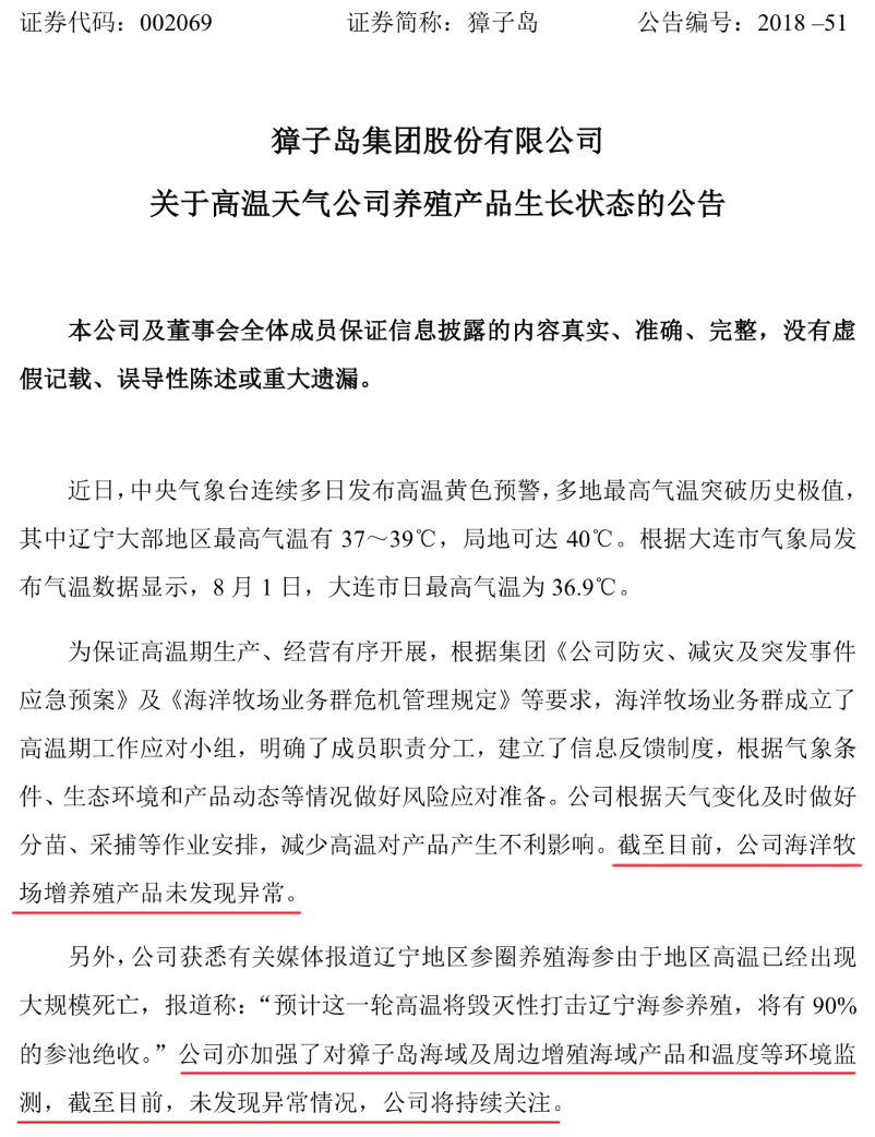 8月2日晚间,獐子岛公告称,公司的海参未出现异常。