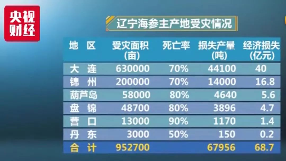 央视记者日前从辽宁海洋渔业厅了解到,连续高温天气使全省海参受高温灾害损失面积95万亩,损失产量6.8万吨,经济损失68.7亿元。特别是大连地区,受灾面积63万亩,死亡率70%,损失产量4.41万吨,经济损失40亿元。