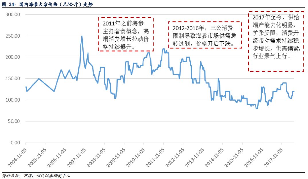 海参价格从2011年220元/公斤的高位急速下滑,跌至2016上半年80元/公斤,5年内价格下降幅度超过60%。而随着行业自发去产能,加上消费升级,海参价格从2017年开始回暖。