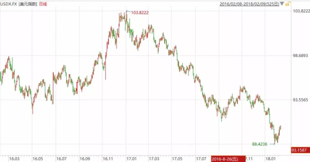 美元指数在2017年1月3日创下103.82的十余年新高之后,转身步入下行通道,这轮跌势一直持续到今年2月,美元指数在最低跌至88.25之后才企稳。