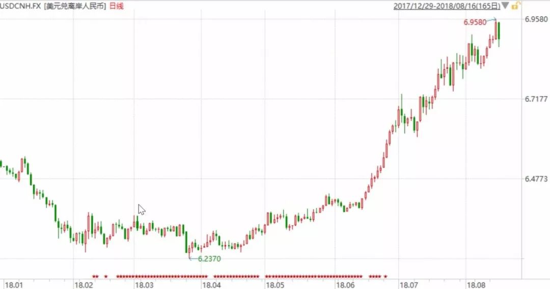 8月15日,就在央行开展了3830亿元MLF操作的当天,在岸人民币兑美元汇率跌破了6.9,最低至6.9350,离岸人民币最低跌破6.95,最低至6.9580。
