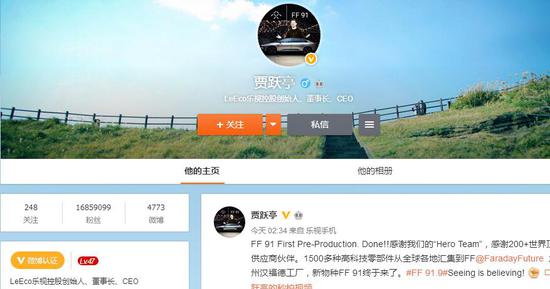 “FF 91 First Pre-Production. Done!!感谢我们的‘Hero Team’,感谢200+世界顶级供应商伙伴。1500多种高科技零部件从全球各地汇集到FF@FaradayFuture加州汉福德工厂,新物种FF 91终于来了。”北京时间29日凌晨2:34分,Faraday Future (下称“FF”)公司创始人兼全球CEO贾跃亭更新微博称。