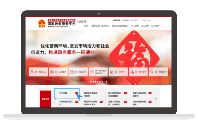 你可以通过电脑使用网页搜索找到“国家政务服务平台”后,首页点击“百日招聘”进入访问,也可以点击下方图片直达“百日招聘”专题。