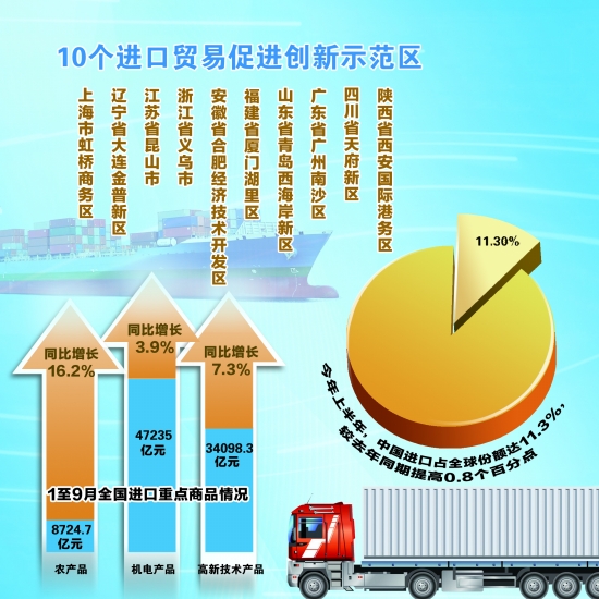 李兴乾介绍,10个进口贸易促进创新示范区分别是上海市虹桥商务区、辽宁省大连金普新区、江苏省昆山市、浙江省义乌市、安徽省合肥经济技术开发区、福建省厦门湖里区、山东省青岛西海岸新区、广东省广州南沙区、四川省天府新区和陕西省西安国际港务区。10个示范区覆盖东中西部和东北地区,体现中国进口发展的动力和潜能。