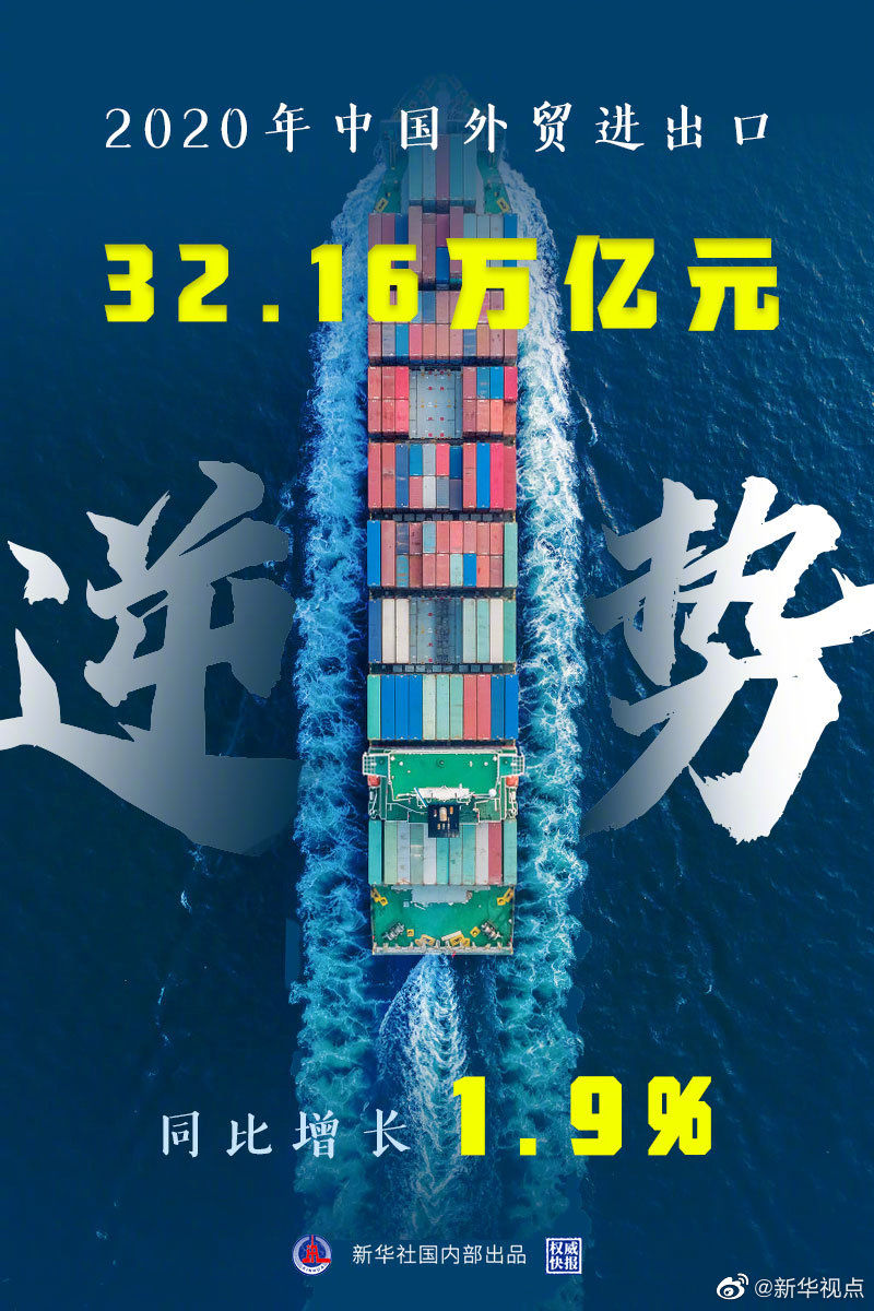 首页>要闻>财经要闻 权威快报丨逆势新高!我国2020年外贸同比增长1.9% 新华视点微博2021-01-14 10:12 海关总署14日发布数据,2020年我国货物贸易进出口总额 32.16万亿元,同比增长1.9%,中国外贸逆势上扬。(记者刘红霞)