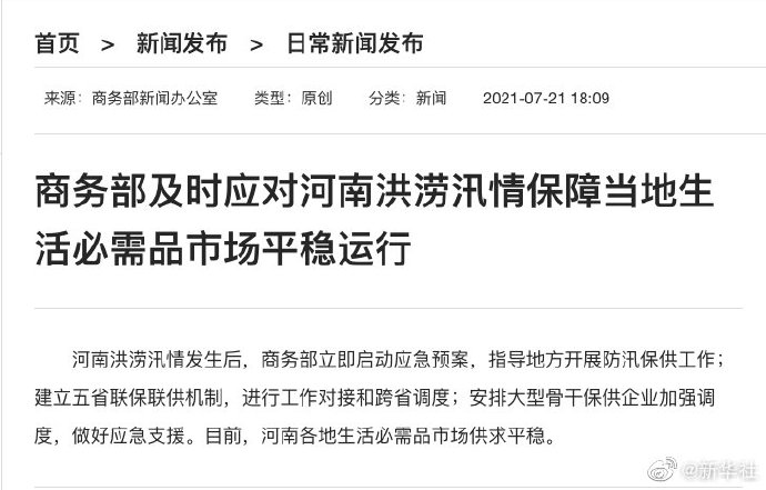 商务部7月21日发布消息,河南洪涝汛情发生后,商务部立即启动应急预案,指导地方开展防汛保供工作;建立五省联保联供机制,进行工作对接和跨省调度;安排大型骨干保供企业加强调度,做好应急支援。目前,河南各地生活必需品市场供求平稳。(记者于佳欣)