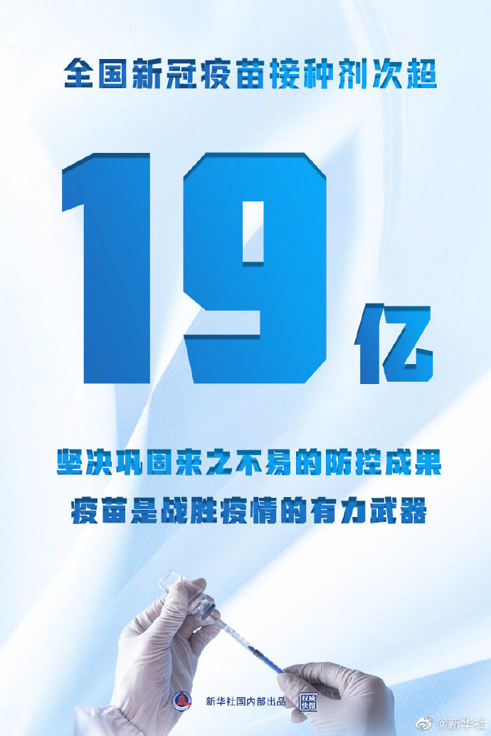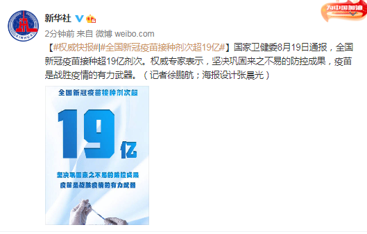 首页>要闻>财经要闻 全国新冠疫苗接种剂次超19亿 新华社微博2021-08-19 15:32 国家卫健委8月19日通报,全国新冠疫苗接种超19亿剂次。权威专家表示,坚决巩固来之不易的防控成果,疫苗是战胜疫情的有力武器。(记者徐鹏航;海报设计张晨光)