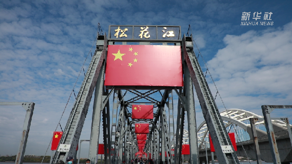 国庆节来临,哈尔滨市滨洲铁路桥上“安装”了500余面国旗,与党史学习教育长廊交相辉映。