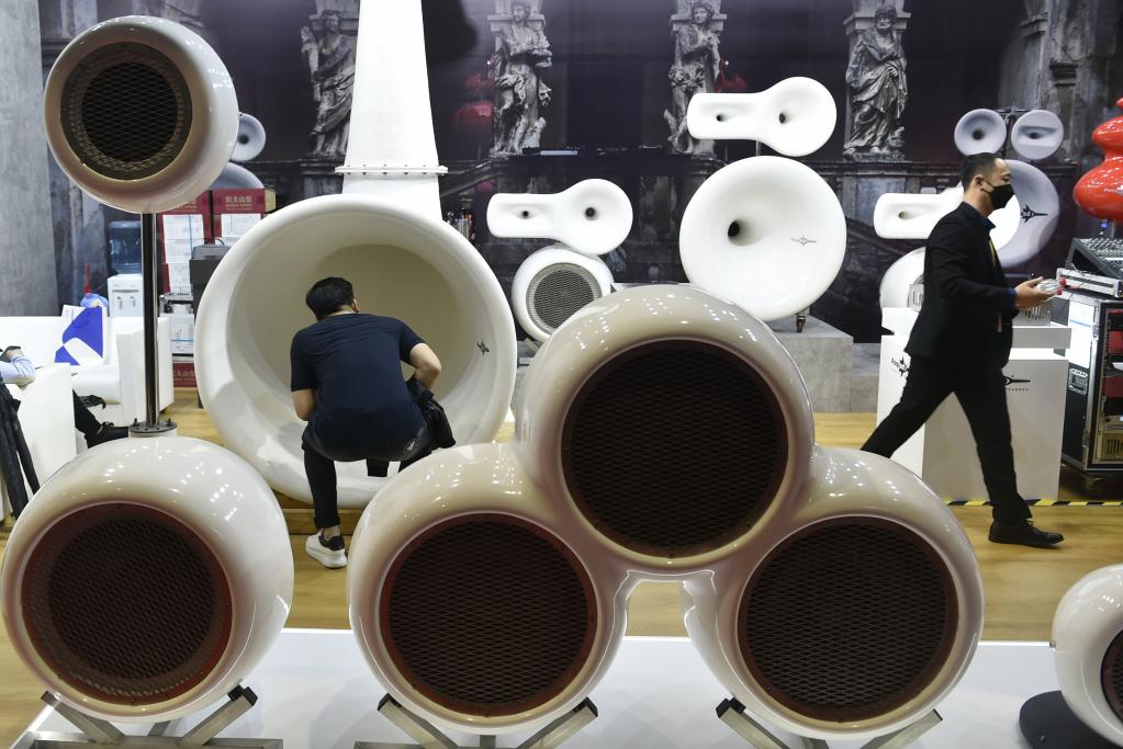 11月6日,参会者在第四届进博会展馆里的意大利PEQUOD公司展位参观音响设备。新华社记者 鲁鹏 摄