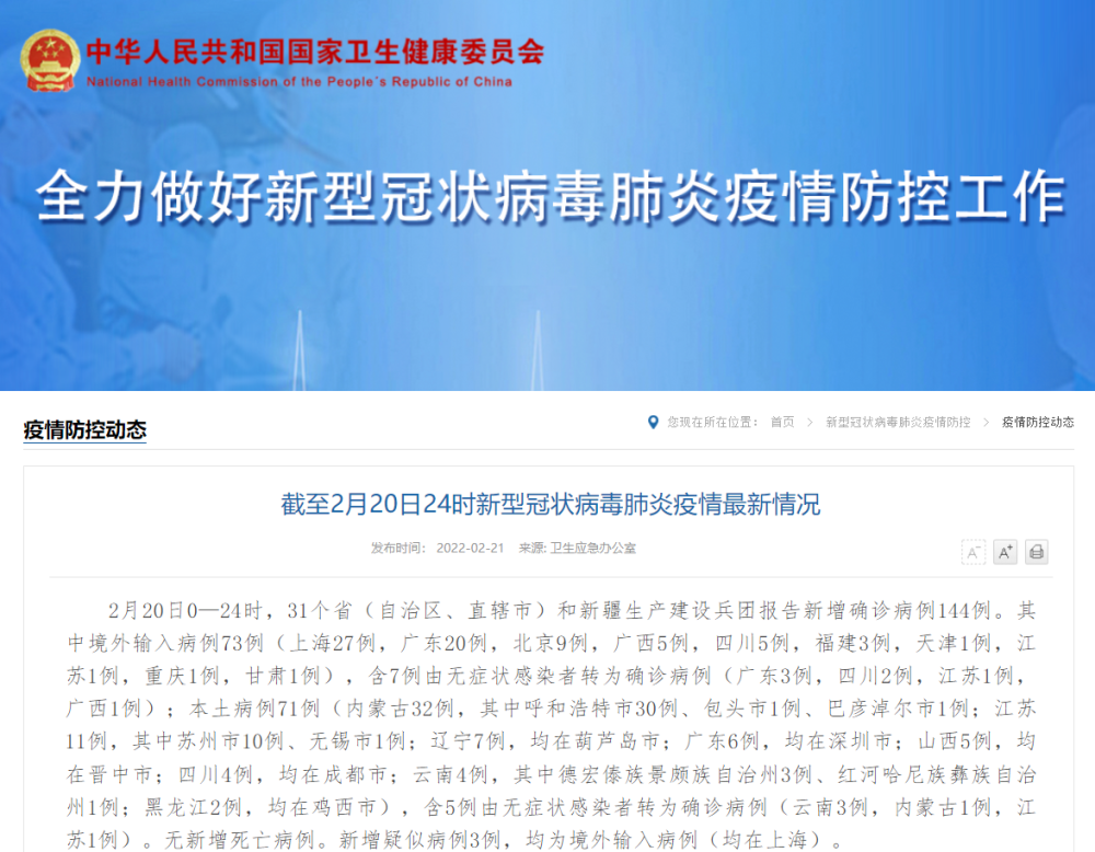 2月20日0—24时,31个省(自治区、直辖市)和新疆生产建设兵团报告新增确诊病例144例。其中境外输入病例73例(上海27例,广东20例,北京9例,广西5例,四川5例,福建3例,天津1例,江苏1例,重庆1例,甘肃1例),含7例由无症状感染者转为确诊病例(广东3例,四川2例,江苏1例,广西1例);本土病例71例(内蒙古32例,其中呼和浩特市30例、包头市1例、巴彦淖尔市1例;江苏11例,其中苏州市10例、无锡市1例;辽宁7例,均在葫芦岛市;广东6例,均在深圳市;山西5例,均在晋中市;四川4例,均在成都市;云南4例,其中德宏傣族景颇族自治州3例、红河哈尼族彝族自治州1例;黑龙江2例,均在鸡西市),含5例由无症状感染者转为确诊病例(云南3例,内蒙古1例,江苏1例)。无新增死亡病例。新增疑似病例3例,均为境外输入病例(均在上海)。