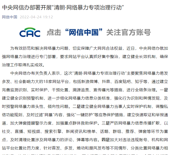 中央网信办部署开展“清朗·网络暴力专项治理行动”