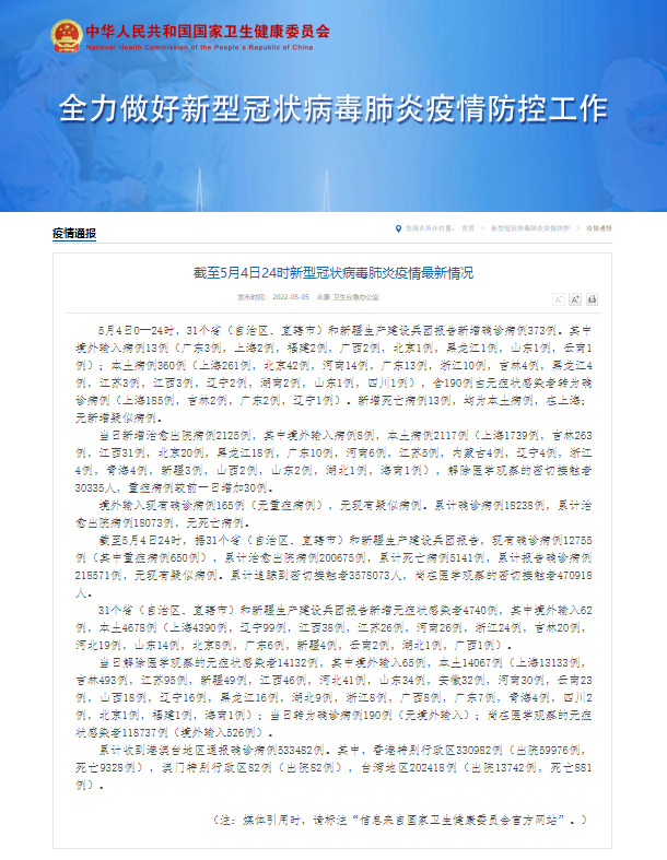 5月4日0—24时,31个省(自治区、直辖市)和新疆生产建设兵团报告新增确诊病例373例。其中境外输入病例13例(广东3例,上海2例,福建2例,广西2例,北京1例,黑龙江1例,山东1例,云南1例);本土病例360例(上海261例,北京42例,河南14例,广东13例,浙江10例,吉林4例,黑龙江4例,江苏3例,江西3例,辽宁2例,湖南2例,山东1例,四川1例),含190例由无症状感染者转为确诊病例(上海185例,吉林2例,广东2例,辽宁1例)。新增死亡病例13例,均为本土病例,在上海;无新增疑似病例。