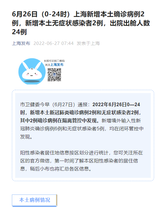 原标题:6月26日(0-24时)上海新增本土确诊病例2例,新增本土无症状感染者2例,出院出舱人数24例