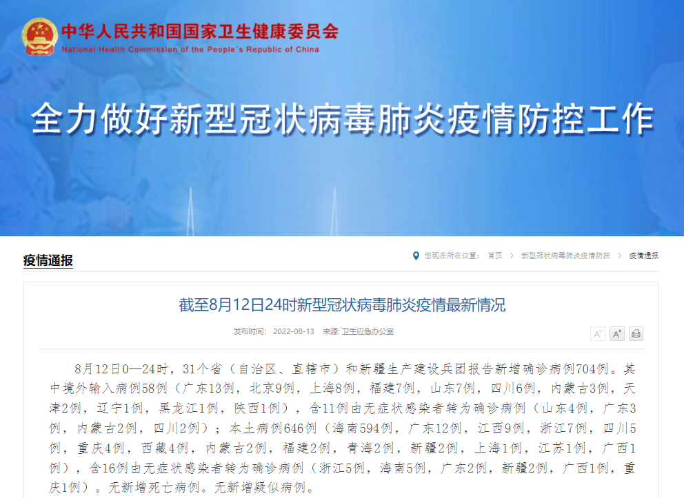 8月12日0—24时,31个省(自治区、直辖市)和新疆生产建设兵团报告新增确诊病例704例。其中境外输入病例58例(广东13例,北京9例,上海8例,福建7例,山东7例,四川6例,内蒙古3例,天津2例,辽宁1例,黑龙江1例,陕西1例),含11例由无症状感染者转为确诊病例(山东4例,广东3例,内蒙古2例,四川2例);本土病例646例(海南594例,广东12例,江西9例,浙江7例,四川5例,重庆4例,西藏4例,内蒙古2例,福建2例,青海2例,新疆2例,上海1例,江苏1例,广西1例),含16例由无症状感染者转为确诊病例(浙江5例,海南5例,广东2例,新疆2例,广西1例,重庆1例)。无新增死亡病例。无新增疑似病例。