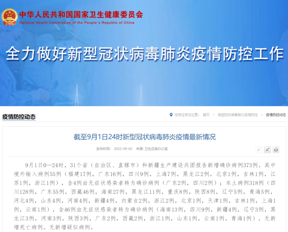 9月1日0—24时,31个省(自治区、直辖市)和新疆生产建设兵团报告新增确诊病例373例。其中境外输入病例55例(福建17例,广东16例,四川9例,上海7例,黑龙江2例,北京1例,吉林1例,江苏1例,浙江1例),含4例由无症状感染者转为确诊病例(广东2例,四川2例);本土病例318例(四川128例,广东55例,西藏46例,海南27例,黑龙江11例,重庆8例,陕西8例,辽宁5例,青海5例,河北4例,山东4例,河南4例,新疆4例,内蒙古2例,浙江2例,北京1例,天津1例,吉林1例,上海1例,云南1例),含46例由无症状感染者转为确诊病例(海南13例,四川9例,新疆4例,辽宁3例,黑龙江3例,河南3例,陕西3例,广东2例,西藏2例,浙江1例,山东1例,云南1例,青海1例)。无新增死亡病例。无新增疑似病例。