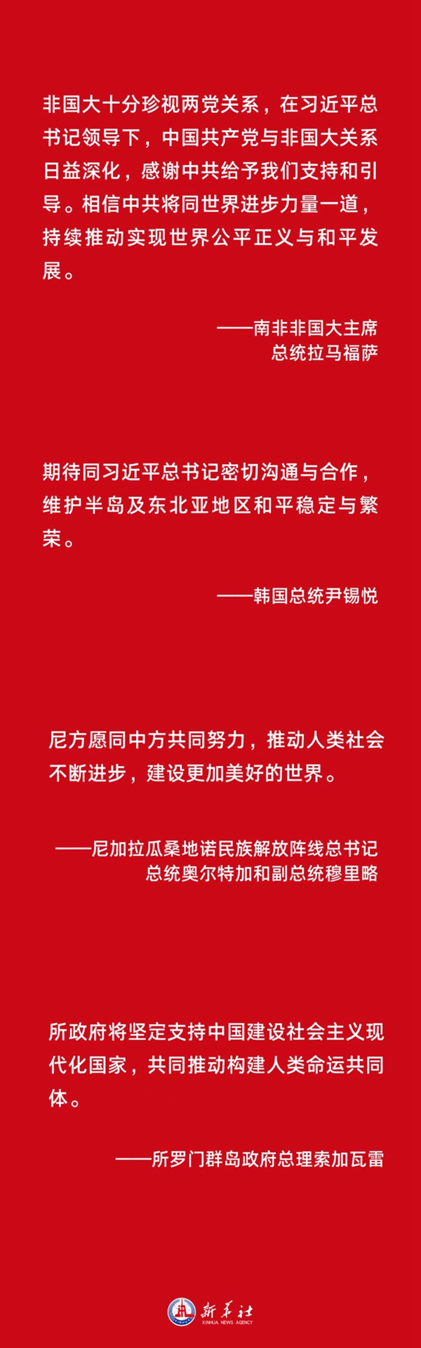 南非非国大主席、总统拉马福萨表示,非国大十分珍视两党关系,在习近平总书记领导下,中国共产党与非国大关系日益深化,感谢中共给予我们支持和引导。相信中共将同世界进步力量一道,持续推动实现世界公平正义与和平发展。