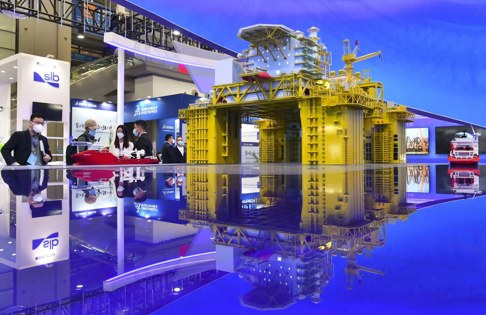 11月24日,观众在海博会现场观看中国海油“深海一号”模型。