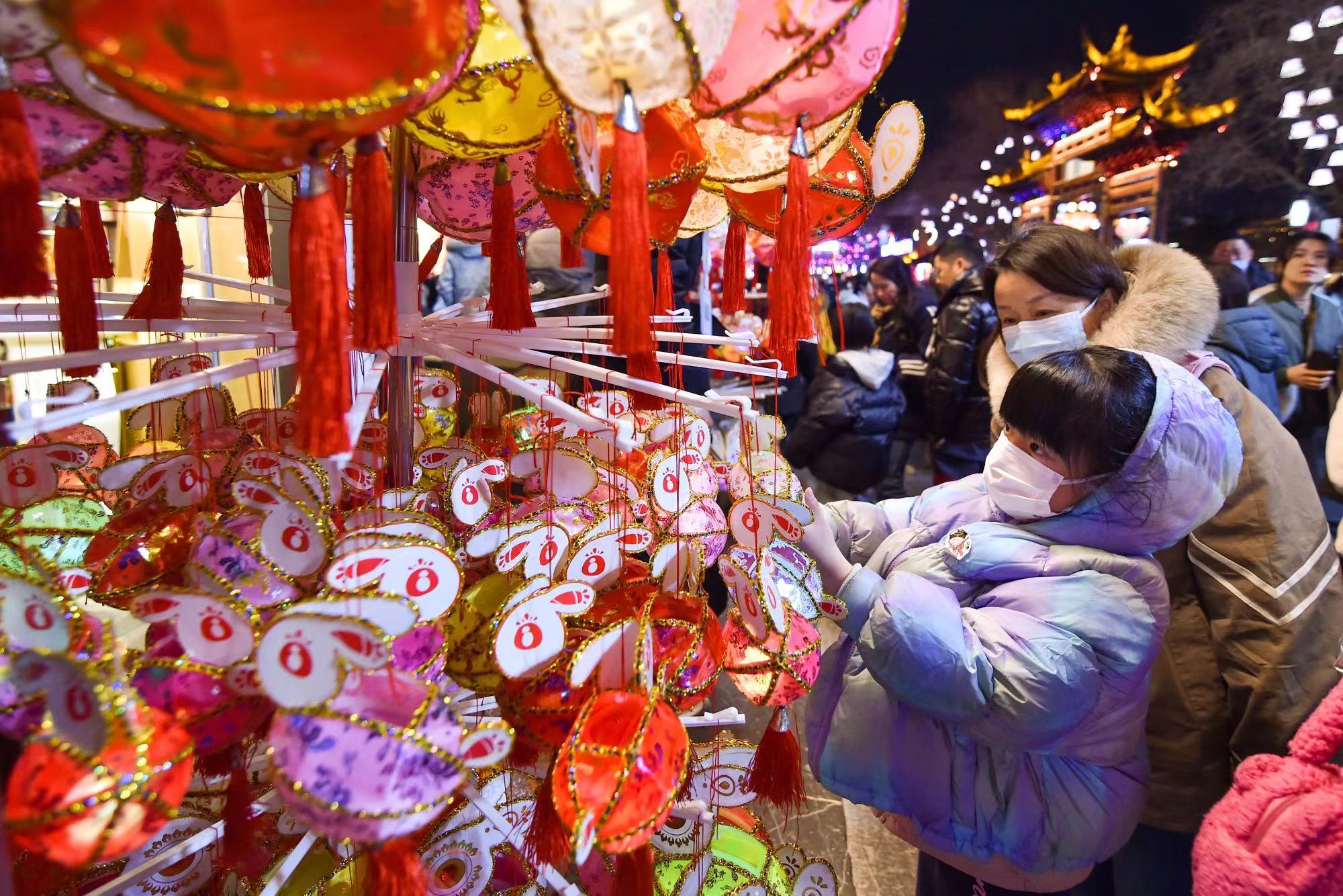 1月28日,一名小游客在南京市夫子庙景区挑选兔灯。