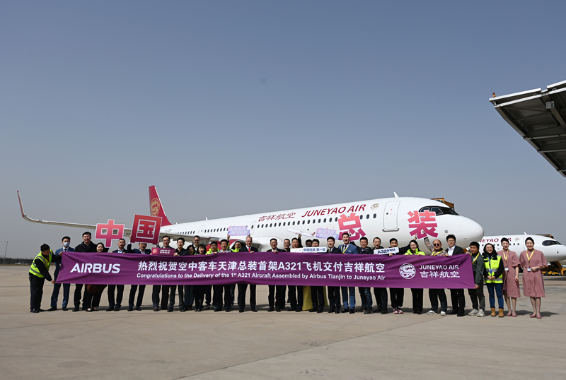 3月24日,参加交付仪式的空中客车和吉祥航空工作人员在A321飞机前合影。