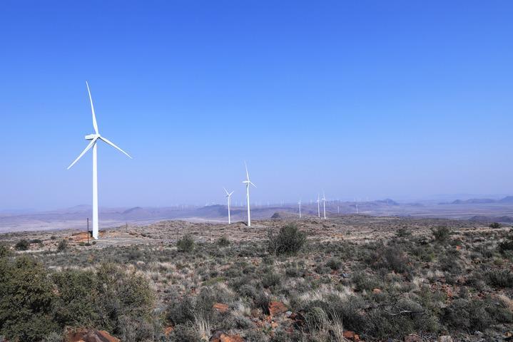 这是8月10日在南非北开普省德阿镇拍摄的中国国家能源集团龙源电力南非公司运营的德阿风电项目风机。新华社记者 董江辉 摄