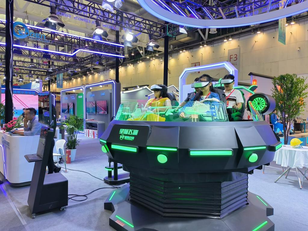 图为展览现场,观众通过虚拟现实设备体验文旅项目。新华社记者何磊静 摄