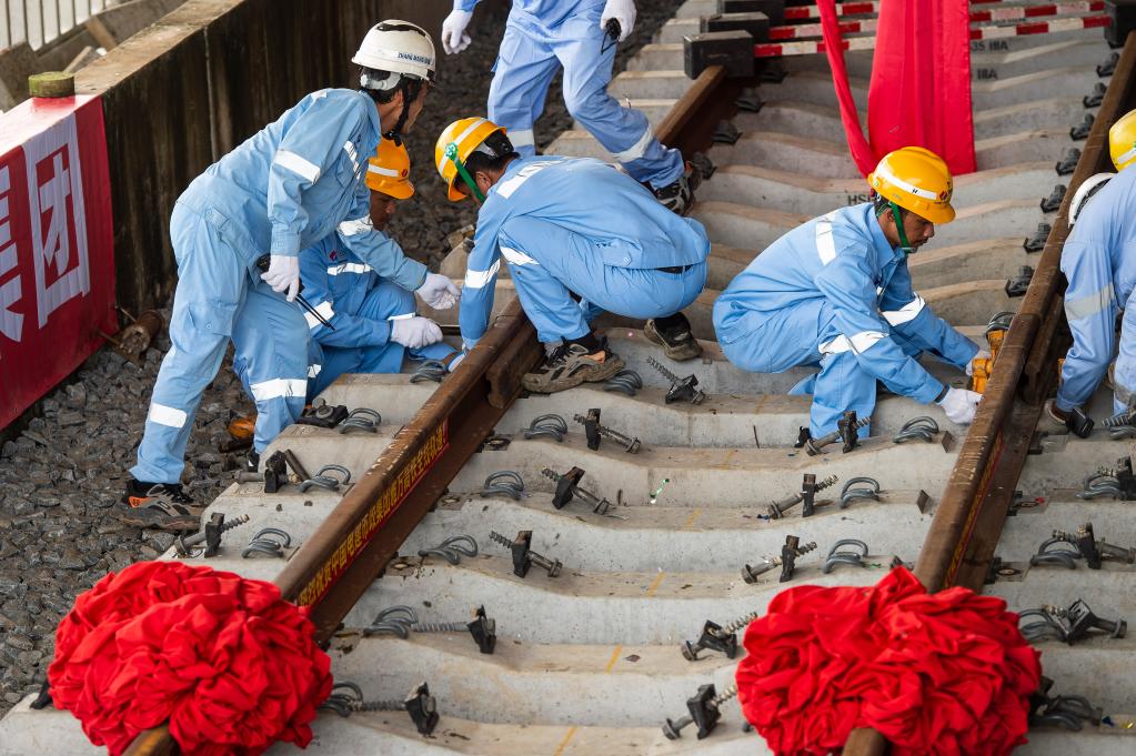 3月31日,在印度尼西亚雅加达雅万高铁哈利姆车站,工人铺设雅万高铁全线最后一根钢轨。