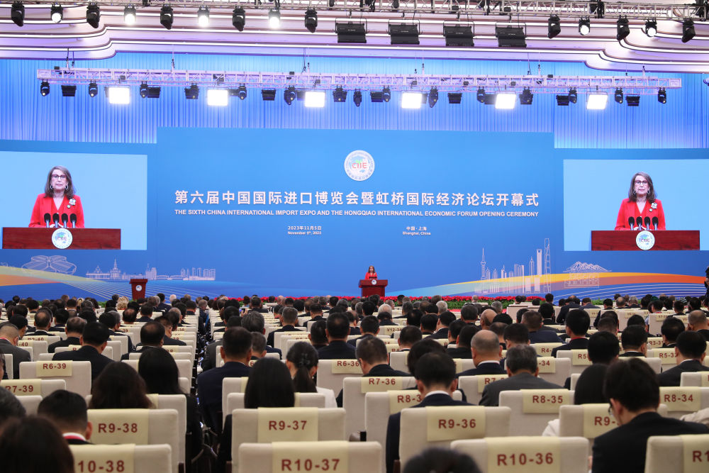 11月5日,联合国贸易和发展会议秘书长格林斯潘在第六届中国国际进口博览会开幕式上致辞。新华社记者 方喆 摄