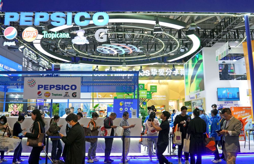 11月8日在第六届进博会食品及农产品展区拍摄的百事公司展台。今年是百事公司首次参展进博会。