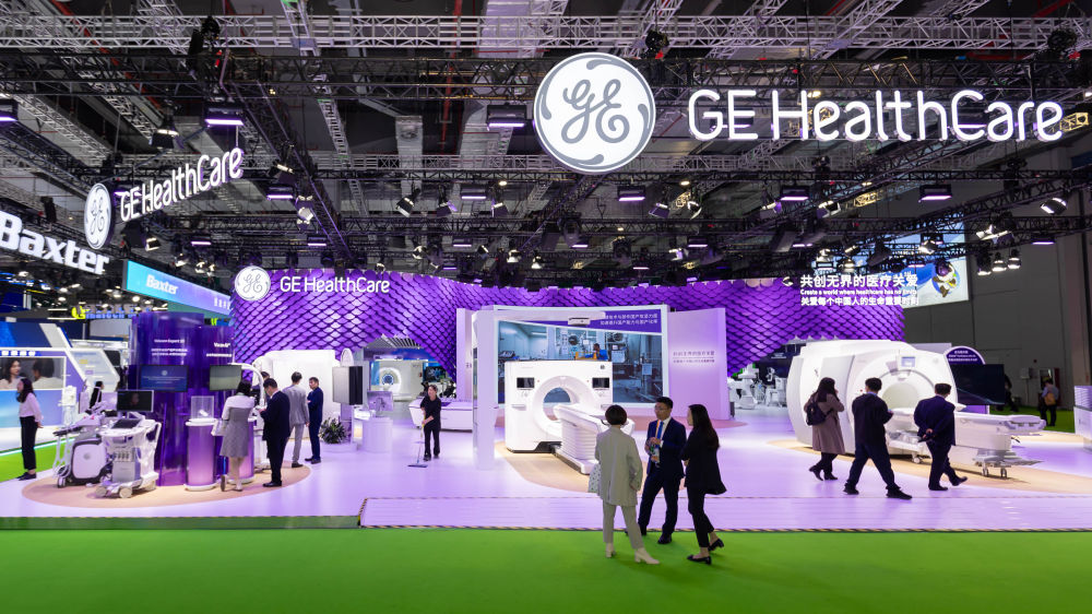 11月8日在第六届进博会医疗器械及医药保健展区拍摄的GE医疗展位。