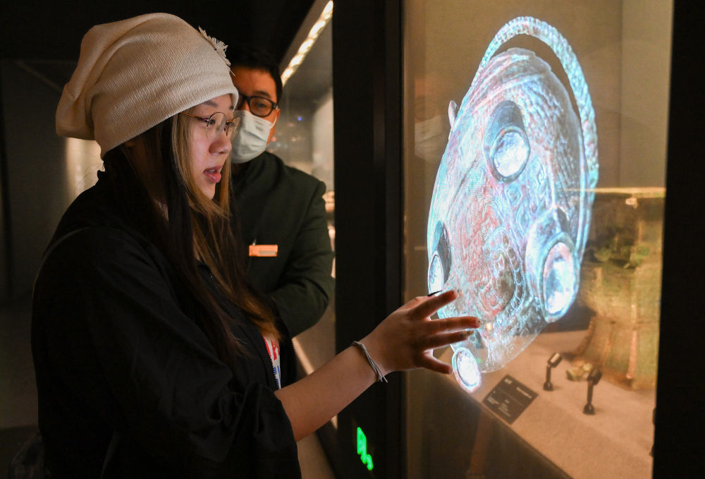 2023年9月15日,观众在位于北京奥林匹克公园核心区的中国考古博物馆内体验互动屏幕。新华社记者 李贺 摄