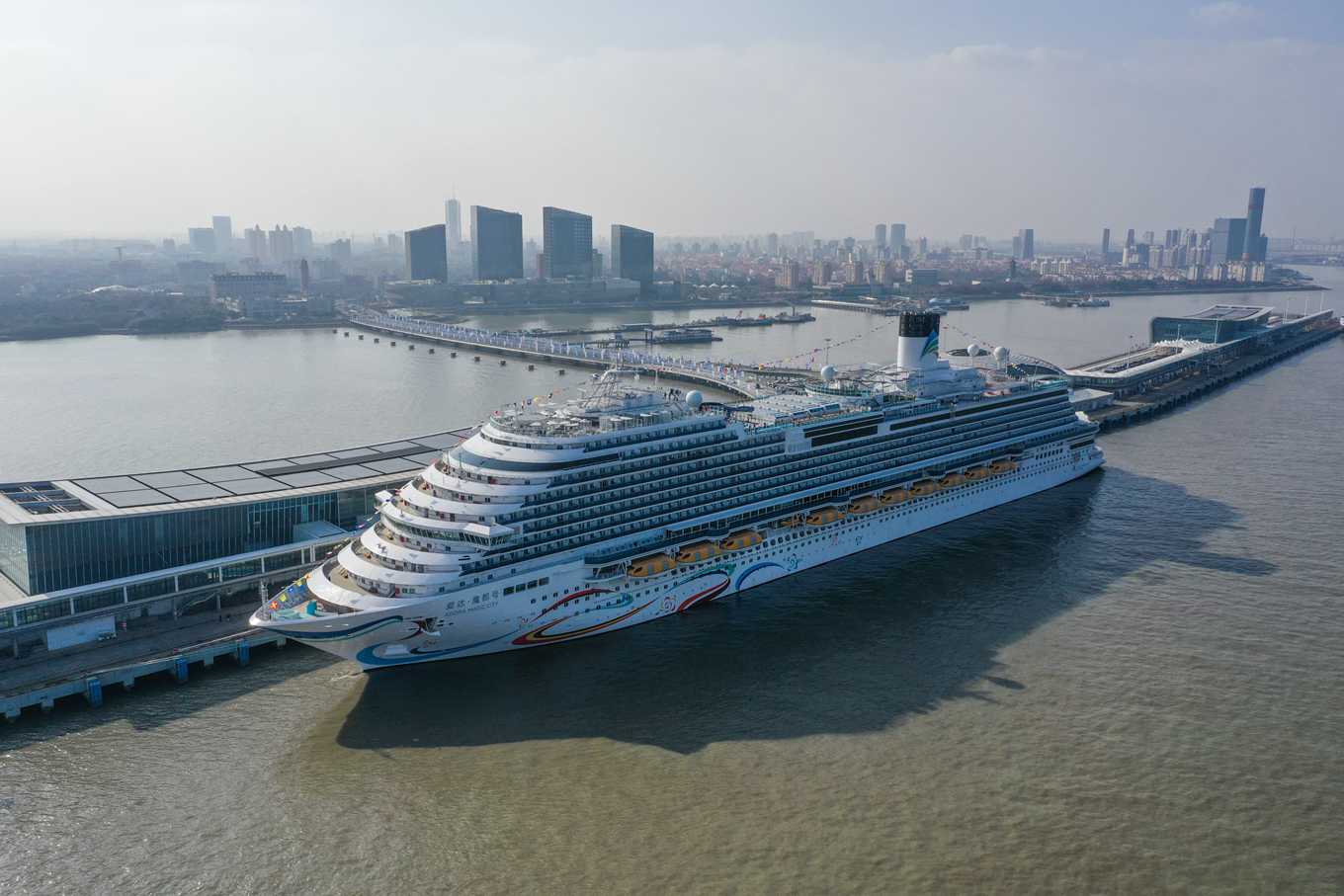 2024年1月1日,“爱达·魔都号”开启商业首航,执行上海至韩国济州、日本长崎和福冈为期七天六晚的航程。韩国济州和日本长崎、福冈对“爱达·魔都号”的首航给予特殊礼遇。图为1月1日,“爱达·魔都号”停靠在上海吴淞口国际邮轮港。