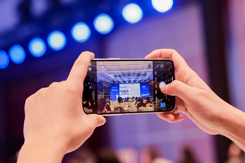 与会嘉宾在拍摄第三届中国城市国际传播论坛活动现场。