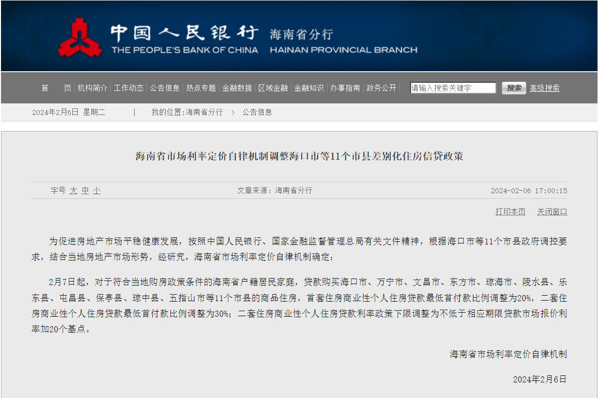 中国人民银行海南省分行官网2月6日发布《海南省市场利率定价自律机制调整海口市等11个市县差别化住房信贷政策》,明确海南省市场利率定价自律机制。