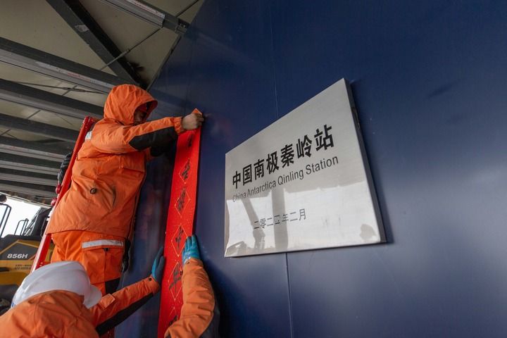 2024年2月9日,工作人员在中国南极秦岭站贴对联。新华社记者 周圆 摄