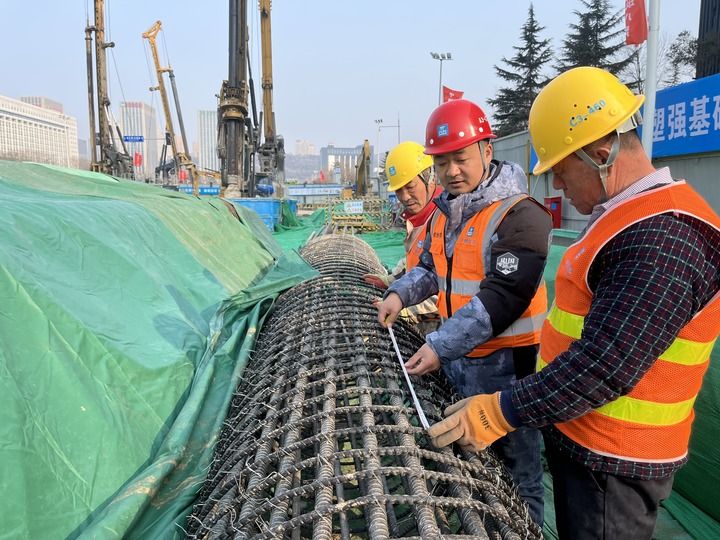 2024年2月9日,在中建八局承建的济南轨道交通7号线一期工程的龙奥大厦站施工现场,质量工程师刘学(中)在检查钢筋笼焊接质量。新华社发