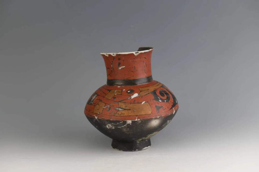 图为寺墩遗址出土的崧泽文化遗存——一件用红、黄、黑三彩绘制的编织纹卷尾鸟形象陶壶。(南京博物院供图)