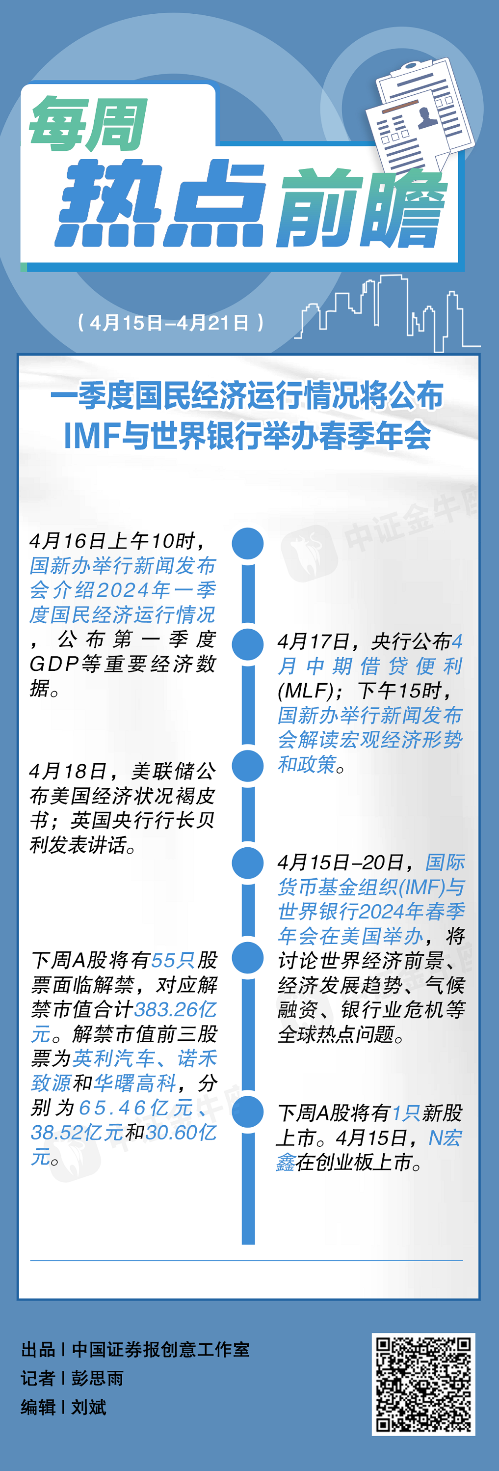 【每周热点前瞻】一季度国民经济运行情况将公布;IMF与世界银行举办春季年会