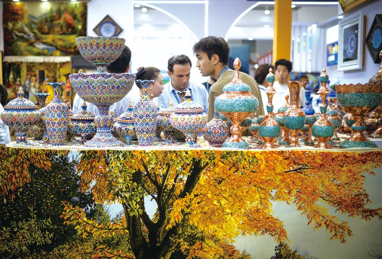 6月26日,在位于乌鲁木齐的新疆国际会展中心,观众在伊朗展台选购商品。