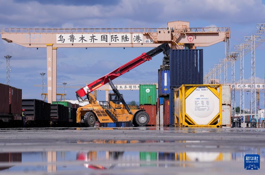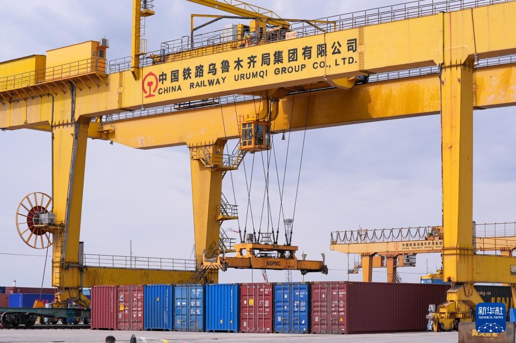 在新疆乌鲁木齐国际陆港区,集装箱装卸作业有序进行(2024年5月27日摄)。新华社记者 王菲 摄