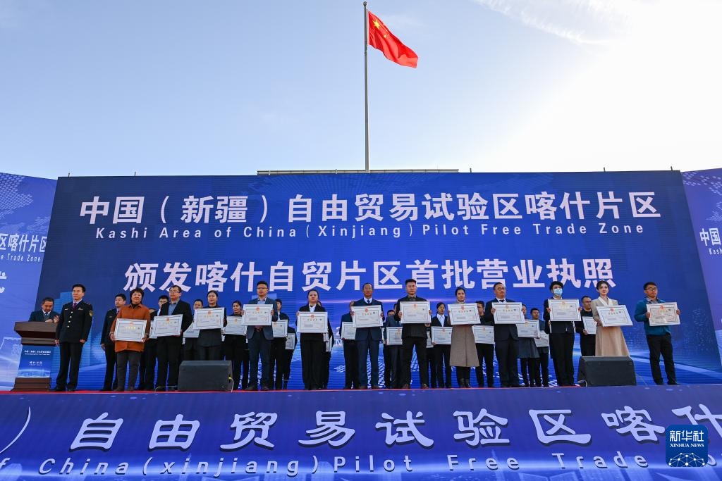 2023年11月11日,在中国(新疆)自由贸易试验区喀什片区揭牌仪式现场,首批入驻自贸片区的经营主体获颁营业执照。新华社记者 丁磊 摄