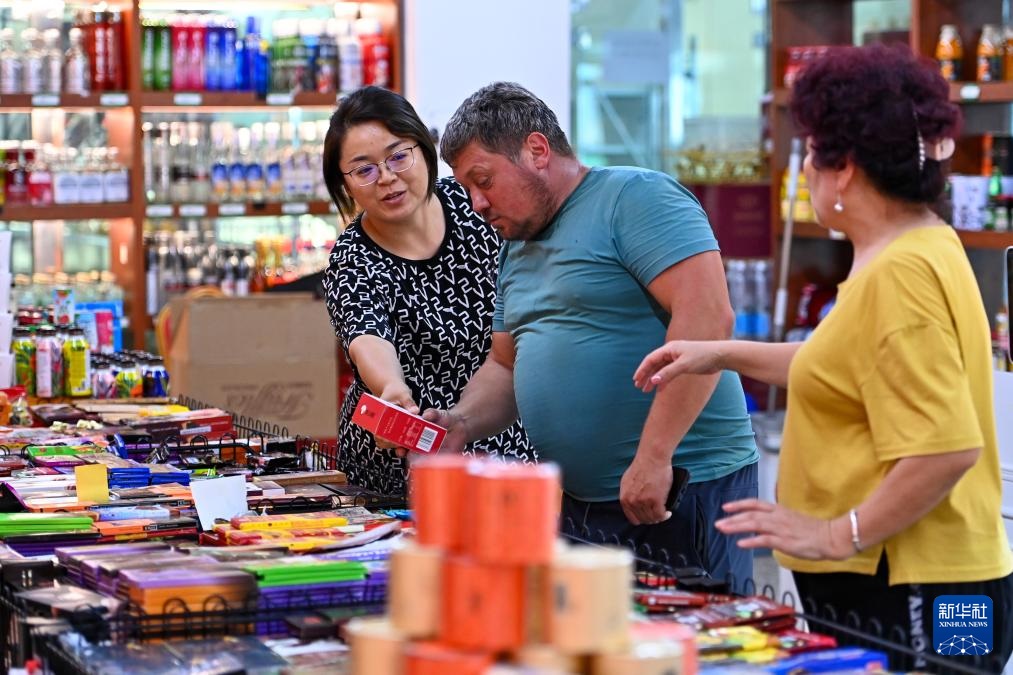 在新疆塔城巴克图中哈边民互市丝路文化商品城,一位哈萨克斯坦的游客在选购商品(2023年7月22日摄)。新华社记者 丁磊 摄