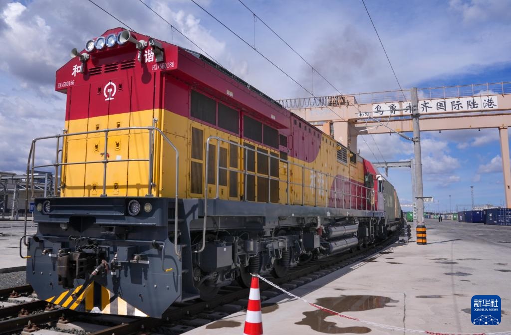 2024年5月27日,一列满载货物的中欧班列驶离新疆乌鲁木齐国际陆港区。新华社记者 王菲 摄
