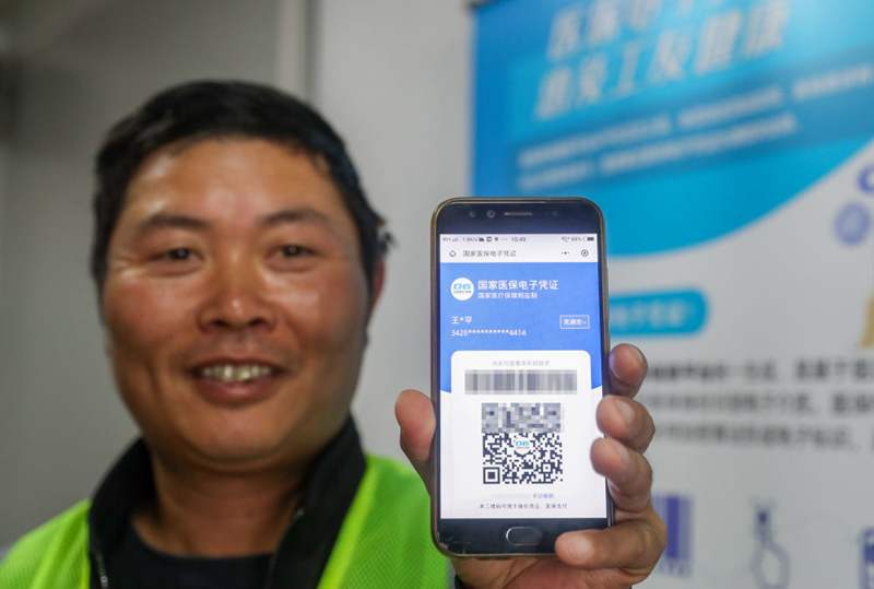 来自安徽的农民工王亚平展示已激活的医保电子凭证(2020年10月20日摄)。新华社记者 丁汀 摄