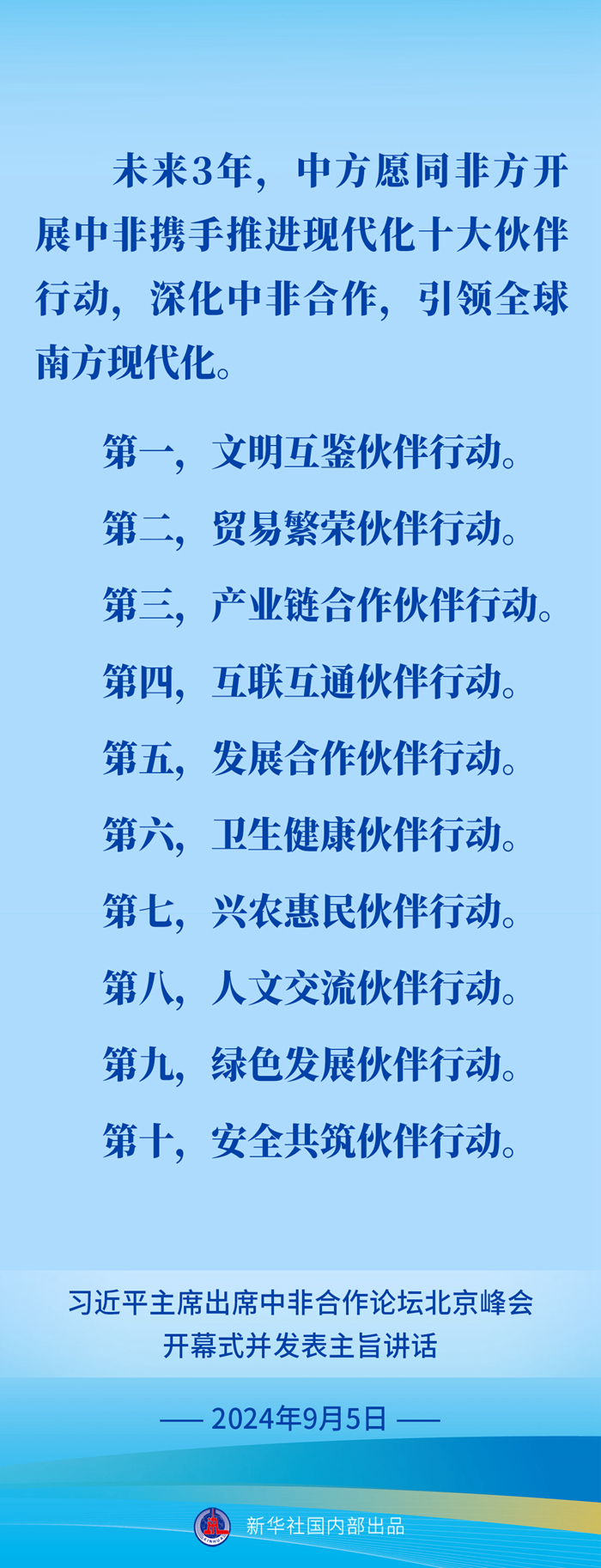 首页 > 要闻>财经要闻 新华社权威快报 | 习近平宣布将实施中非携手推进现代化十大伙伴行动 新华社 2024-09-05 14:00 9月5日,习近平主席出席中非合作论坛北京峰会开幕式并发表主旨讲话,宣布将实施中非携手推进现代化十大伙伴行动。