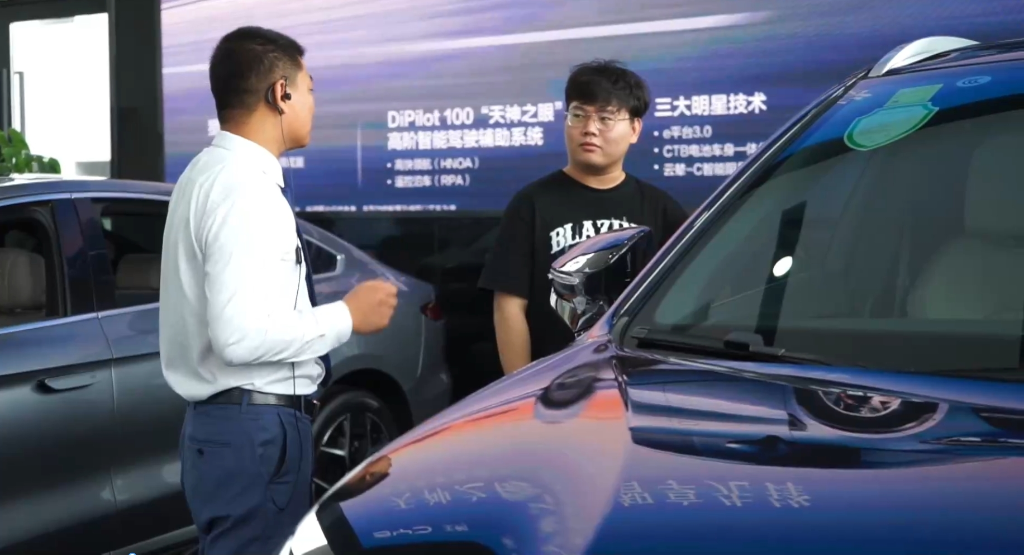 河北沧州某汽车品牌4S店内,工作人员在向顾客介绍相关信息。