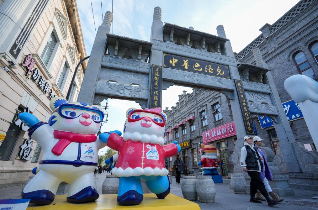 在哈尔滨中华巴洛克历史文化街区,游客从亚冬会吉祥物雕塑旁走过。2025年第九届亚洲冬季运动会将于2025年2月7日开幕。新华社记者 王建威 摄